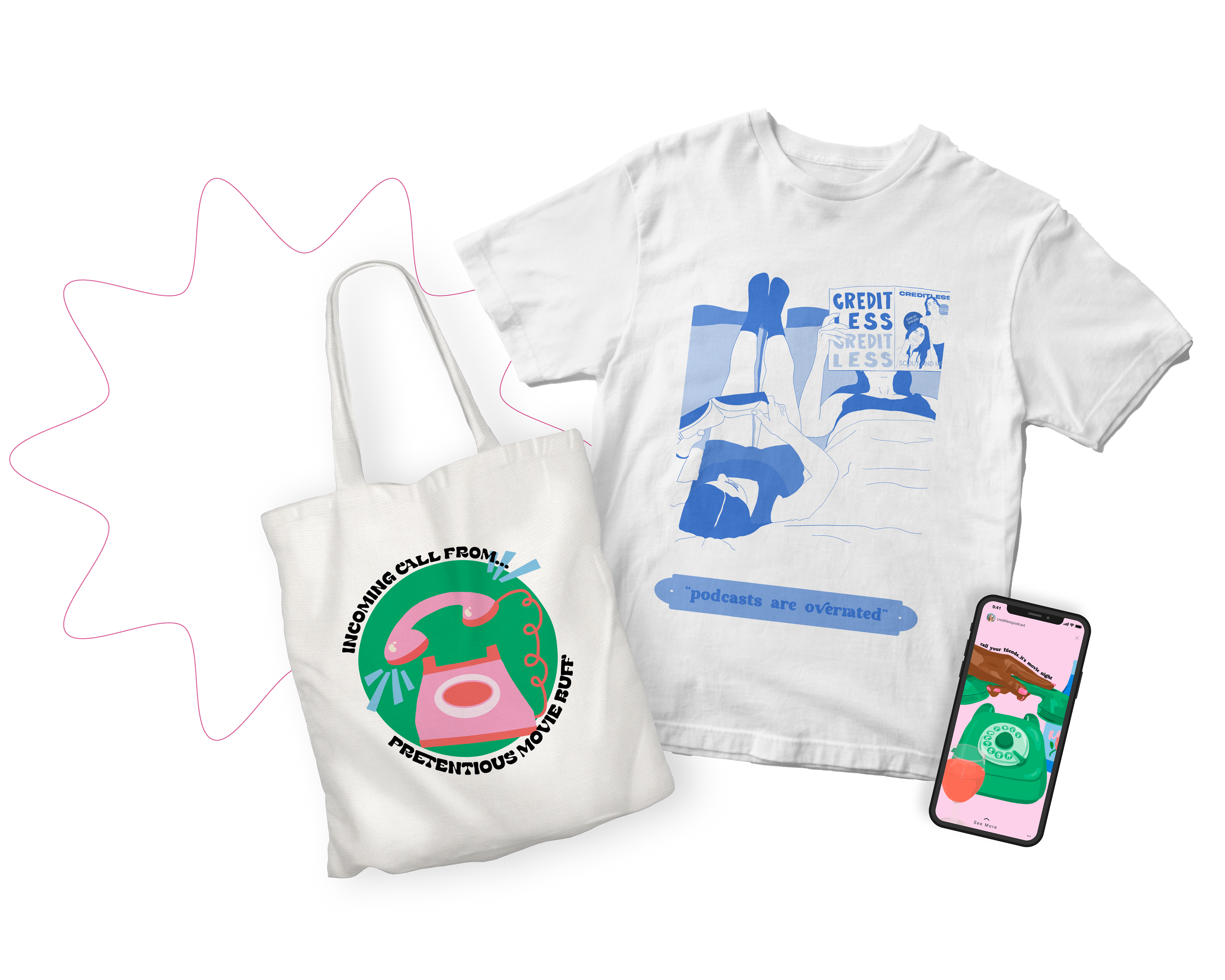 Creditless is a podcast focused on the film and entertainment industry based in LA. The podcast reached out to me to create merch for their growing audience comprised of women in their early twenties. With groovy typefaces, a bold, bright color palette and fun illustrations, I leveraged Creditless’ nostalgia for the early aughts and playful, hyper-feminine branding to create merch that Creditless fans will be proud to display.