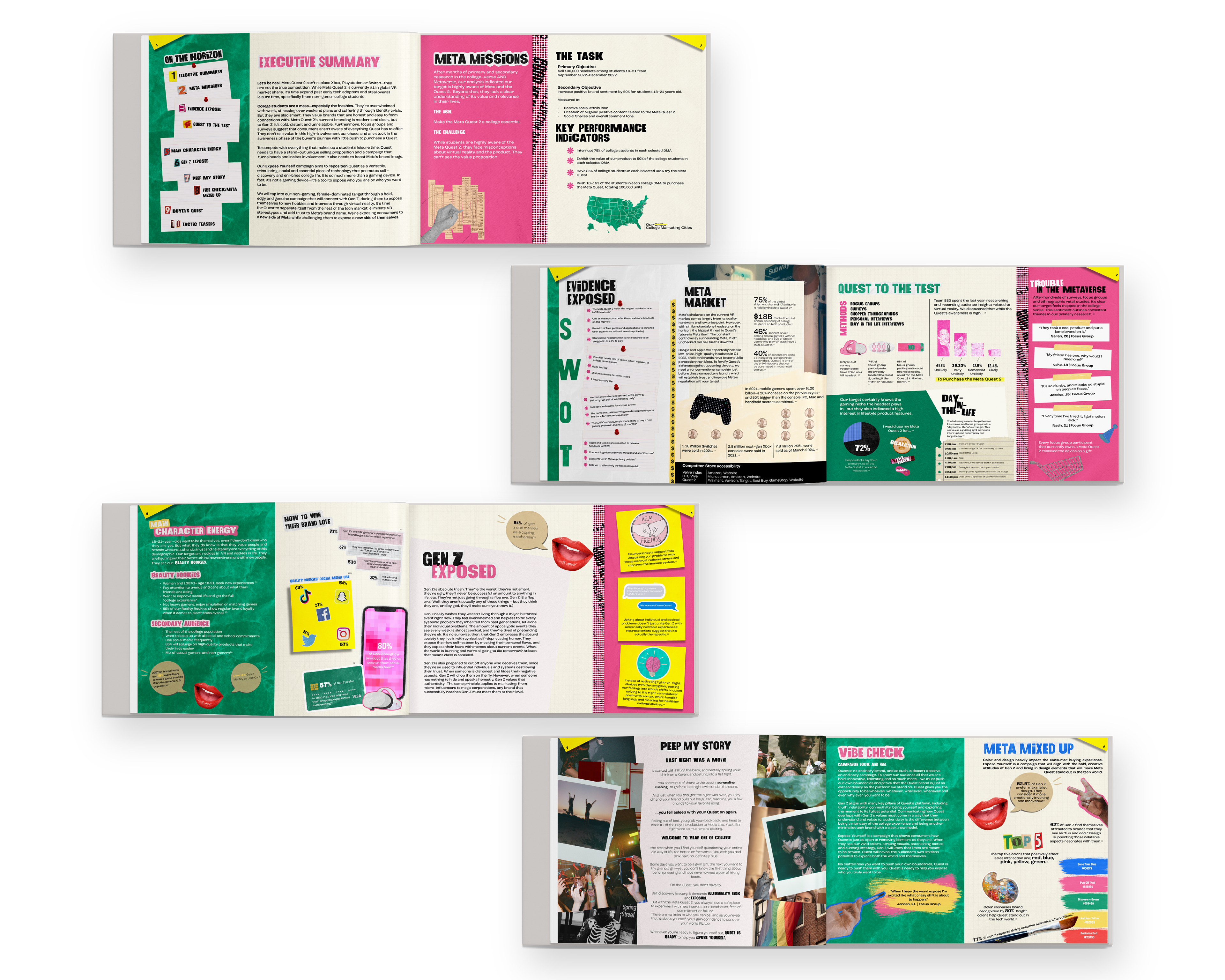 It was clear that Meta's stale, minimalistic tech look wasn't vibing with Gen Z. With this in mind, I led our campaign in a bolder, creative direction inspired by artists Hannah Höch and Barbara Krueger. The collage motif emboldens Meta’s blue and transforms VR from a nebulous, “Internet” experience to a human, tactile adventure that attracts Gen Z.